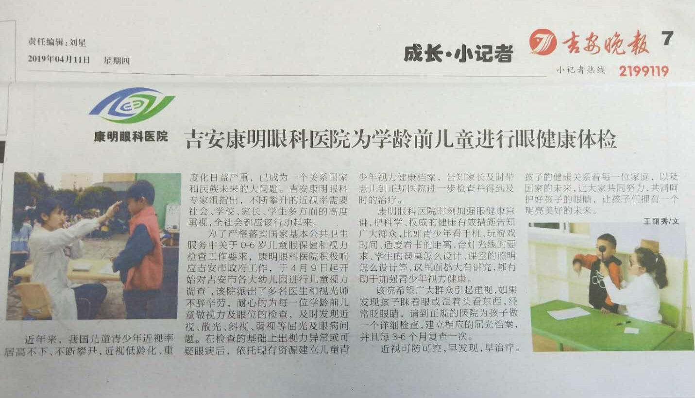 为了严格落实国家基本公共卫生服务中关于0-6岁儿童眼保健和视力检查工作要求,康明眼科医院积极响应吉安市政府工作,于2019年4月9日起开始对吉安市各大幼儿园进行儿童视力调查 ,我院派出了多名医生和视光师不辞辛劳,耐心的为每一位学龄前儿童做视力及眼位的检查,及时发现近视、散光、斜视、弱视等屈光及眼病问题。在检查的基础上出视力异常或可疑眼病后,依托现有资源建立儿童青少年视力健康档案,告知家长及时带患儿到正规医院进一步检查并得到及时的治疗。